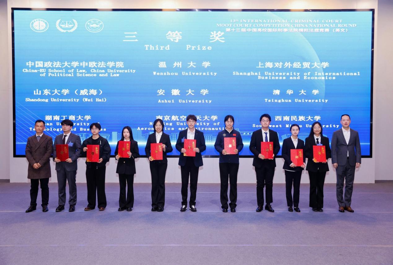 3月7日至8日,第13届中国高校国际刑事模拟法庭英文赛在安徽大学举行。我院参赛队伍凭借扎实的法学专业功底、出色的临场应变能力以及默契的团队合作,荣获全国三等奖。