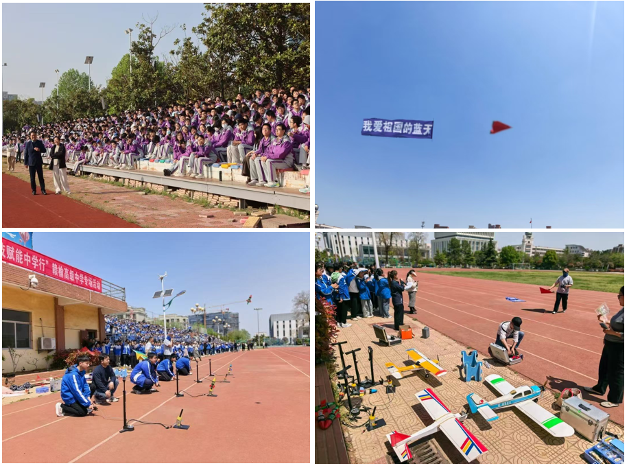南航航模队先后在新海高级中学、赣榆高级中学带来“我爱祖国的蓝天”主题表演。遥控滑翔机、多旋翼无人机、创意航模依次升空,精准操控、特技飞行、编队展示,将现场气氛推向高潮。