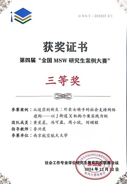 在总决赛中,我院团队凭借扎实的社会工作实践分析和创新的介入策略,最终斩获了大赛三等奖。该团队由23级社会工作专业黄星晨、冯可盈以及24级社会工作专业周小欣、刘硕程组成,在团队成员的共同努力下,团队不仅展示了对外卖女骑手群体需求的深入理解,还提出了可操作的社会支持网络建构方案,为外卖女骑手的社会支持提供了新思路。