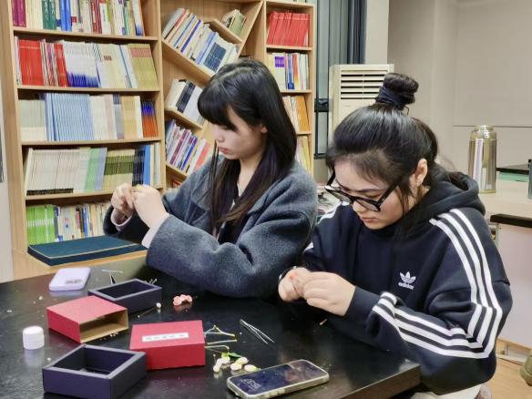 在美育体验环节,绒花制作技艺市级代表性传承人、市民间文艺家协会编织绣研究会副会长程颖应邀主讲。她讲述了“绒花”这项非物质文化遗产的历史渊源,还带领大家亲手体验绒花制作的基础技艺。当一件件精巧的绒花作品在指尖诞生,同学们不仅领略到非遗技艺的精妙,更体会到专注、耐心的工匠精神。