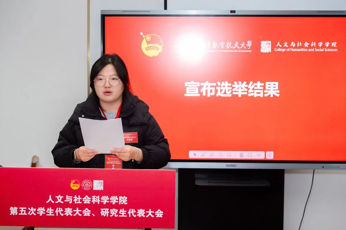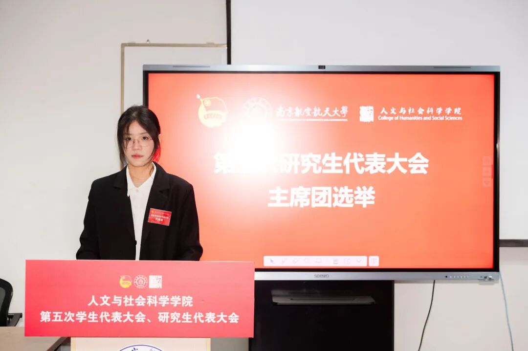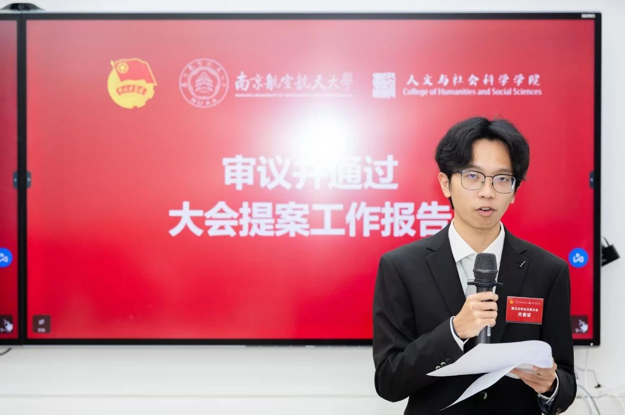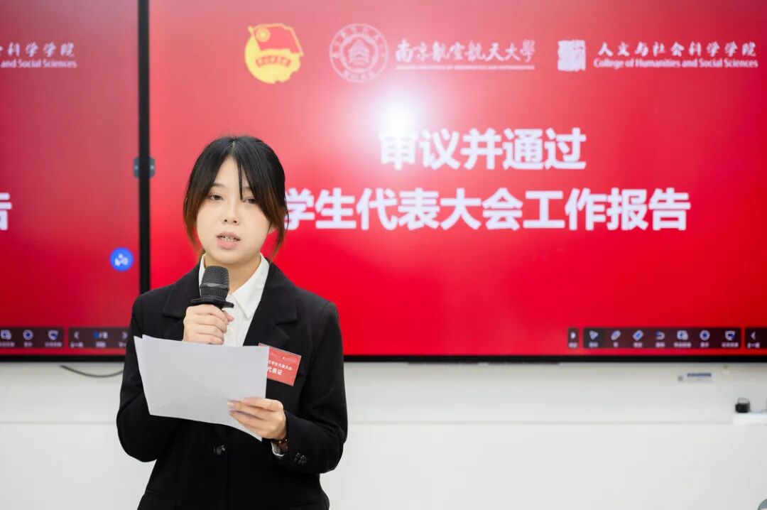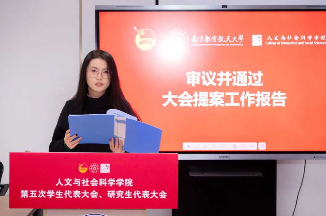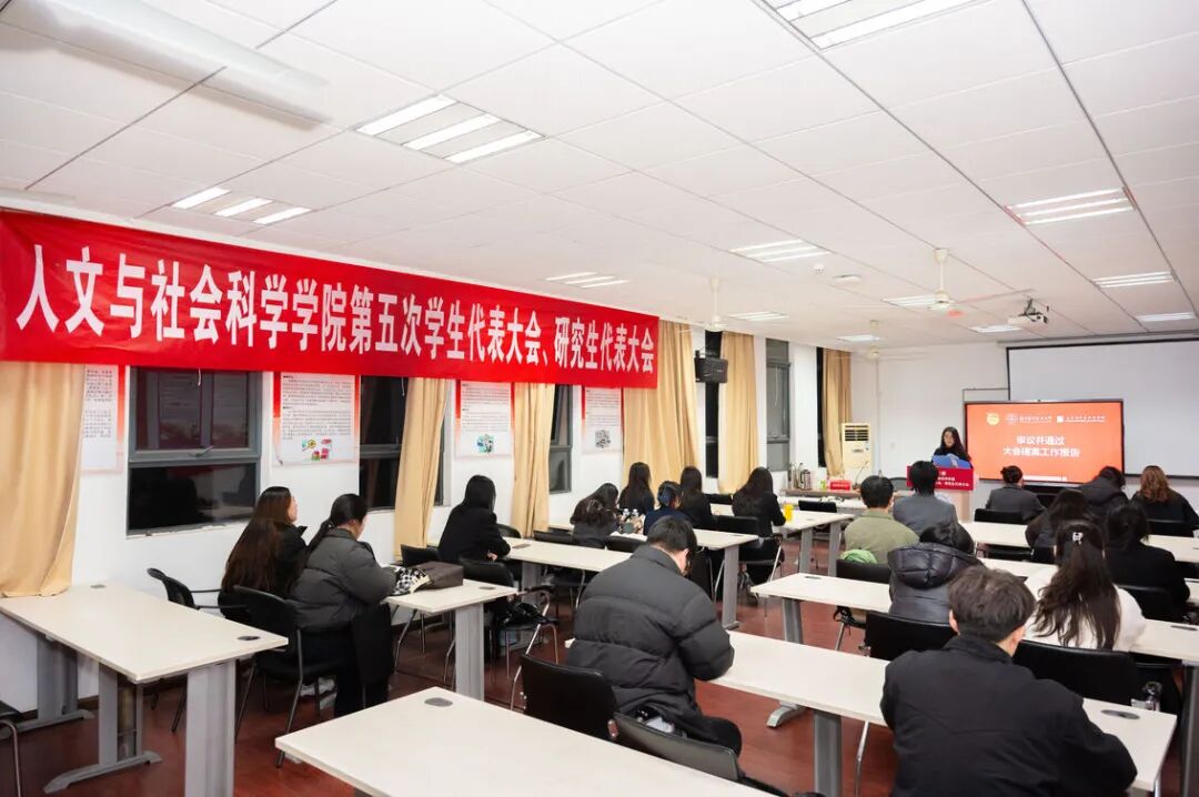 袁雯倩代表校学生会、校研究生会致辞。随后,学代会、研代会正式会议分别在院楼213、210会议室召开。白佳禾代表我院第四届学生会委员会作了题为《凝心笃行、筑梦人文,服务成长、聚力前行》的工作报告,周小欣代表我院第四届研究生会委员会作了题为《以青春之力践行服务初心,以人文之智护航成长之路》的工作报告。
